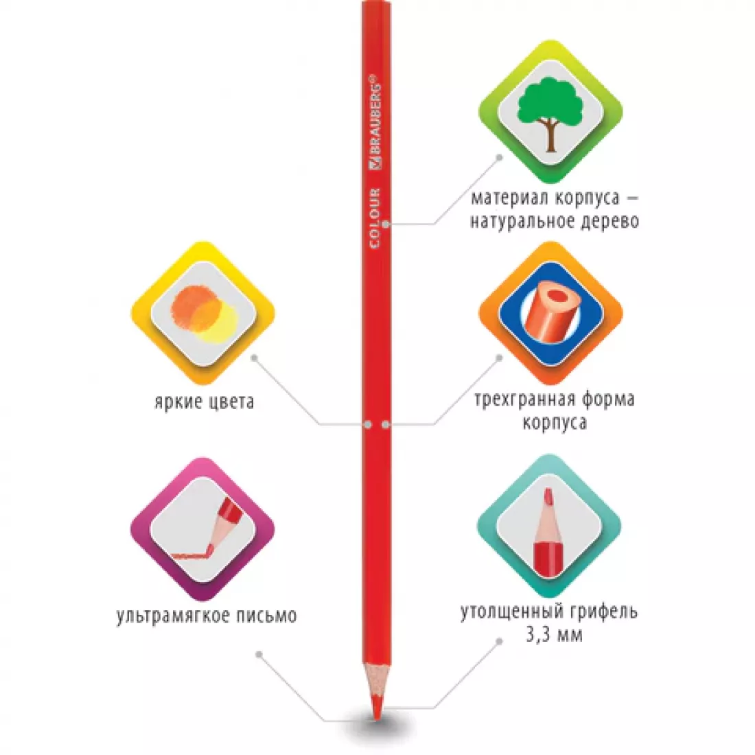 Трехгранные деревянные цветные карандаши премиального качества BRAUBERG PREMIUM серии "Color" обеспечивают гладкое письмо благодаря экстрамягкому грифелю. Особое качество красящего пигмента обеспечивает насыщенные яркие цвета.